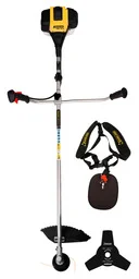 Desbrozadora de gasolina - Cilindrada 38,9 cc, potencia 1,4 CV. Manillar doble plegable sin herramientas. Incluye arnés, disco de 3 puntas y cabezal de hilo.
